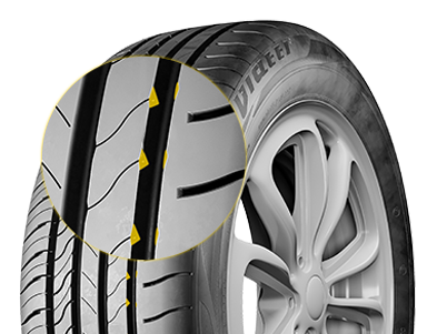 Фирменные индикаторы износа облегчают контроль состояния шин в ключевых точках: по окружности; между внешней и внутренней сторонами рисунка протектора; между центральной и плечевой зонами.